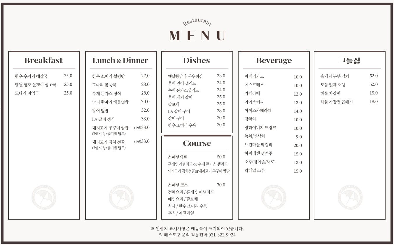 특급호텔 출신 쉐프가 최상급 재료로 정성스럽게 준비한다양한 메뉴들을 탁 트인 코스 전경이한눈에 바라보이는 은화삼 레스토랑에서소중한 분들과 즐겨보시기 바랍니다.